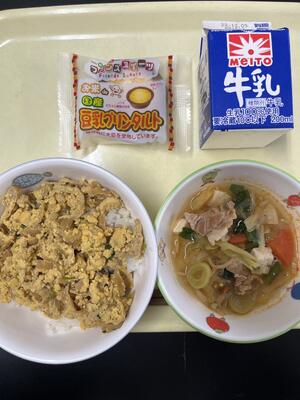 【今日の献立】あぶたまどん キムチなべじる タルト 牛乳