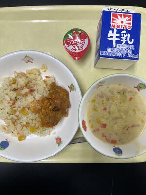 【今日の献立】えびピラフ タンドリーチキン こめことうにゅうコーンスープ ミニゼリー 牛乳