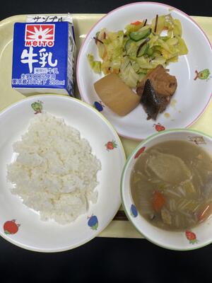 【今日の献立】ごはん ぶりだいこん キャベツのつけもの せんべいじる 牛乳