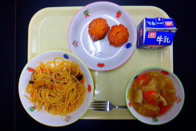 【今日の献立】わふうスパゲッティ やさいスープ にんじんドーナツ 牛乳