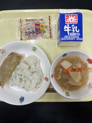【今日の献立】わかめごはん はるまき やさいたっぷりみそしる スイートポテト 牛乳