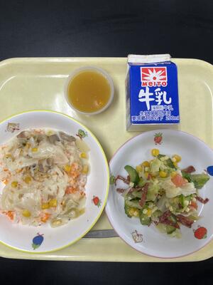 【今日の献立】にんじんピラフクリームソースかけ イタリアンサラダ みかんゼリー 牛乳