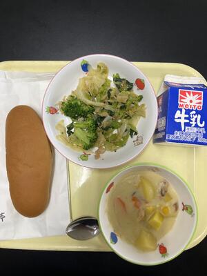 【今日の献立】こくとうパン あきのクリームシチュー ブロッコリーのごまドレ 牛乳