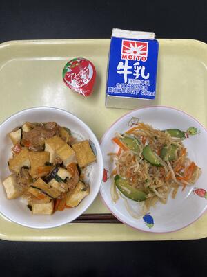 【今日の献立】マーボーどん きりぼしだいこんのちゅうかあえ たけのこちゅうかスープ 牛乳
