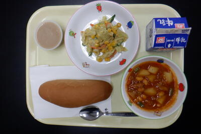 【食材の産地】じゃがいも(北海道)玉ねぎ(北海道)にんじん(富里市)ピーマン(鹿児島県)キャベツ(愛知県)かぶ(船橋市)