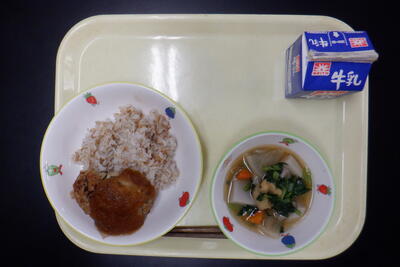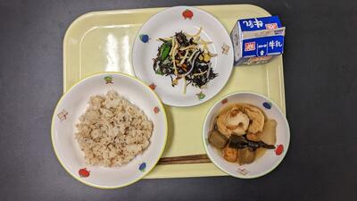 【今日の献立】ひじきごはん れんこんつくね いなかじる 牛乳