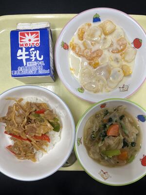 【今日の献立】チンジャオロースどん ワンタンスープ ヨーグルトあえ 牛乳
