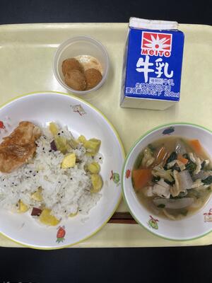 【今日の献立】いもくりごはん とりにくのやくみソース こんさいみそしる しらたまきなこ 牛乳