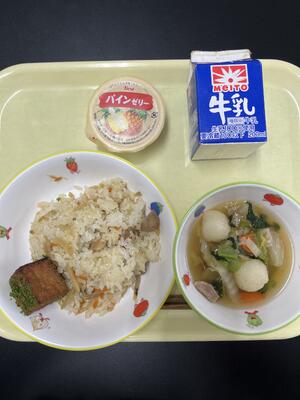 【今日の献立】とりごもくごはん あつあげのいそべやき だまこじる パインゼリー 牛乳