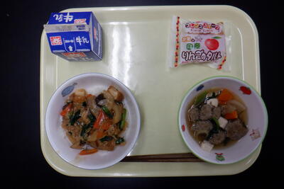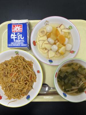 【今日の献立】やきそば たけのこのちゅうかスープ フルーツしらたま 牛乳