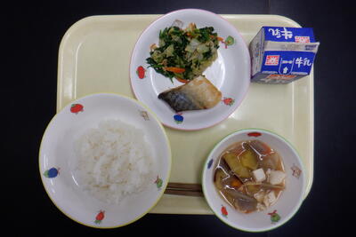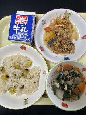 【今日の献立】ごはん さばのさいきょうやき ごまあえ さつまいもじる 牛乳