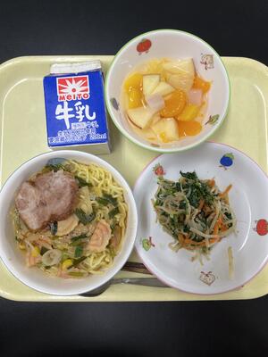 【今日の献立】みそラーメン チャーシュー ナムル サイダーポンチ 牛乳