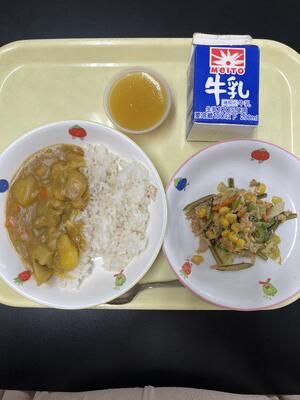【今日の献立】カレーライス ひじきのマリネ キャロットゼリー 牛乳