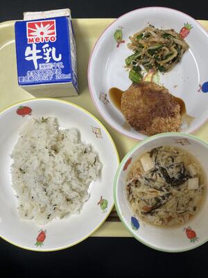【今日の献立】しらすなめし キャベツメンチ おかかあえ もじくいりかきたまじる 牛乳