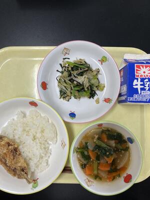 【今日の献立】ごはん いわしのかばやき おひたし だいこんのそぼろじる 牛乳