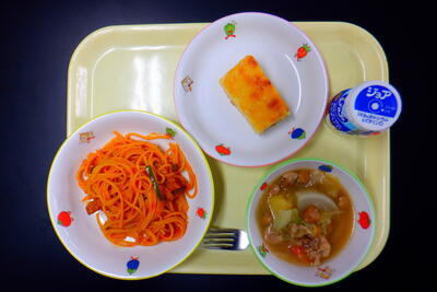 【今日の献立】ミートソーススパゲティ やさいスープ カフェオレゼリー 牛乳