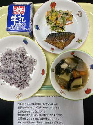 ゆかりごはん さばのしょうがやき ごまマヨあえ さつまいもとわかめのみそしる 牛乳