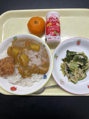 【今日の献立】むぎごはん カツカレー ロースカツ わかめサラダ れいとうみかん ジョア