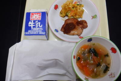 【今日の献立】はちみつパン とりにくのバーベキューソース かぼちゃサラダ トマトスープ 牛乳