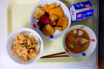 【今日の献立】あぶたまどん はっぽうみそしる さつまチップス 牛乳