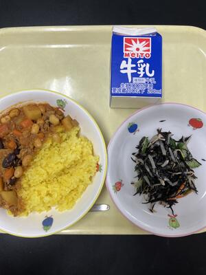 【今日の献立】ターメリックライス チリコンカン ひじきのマリネ 牛乳