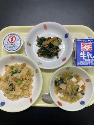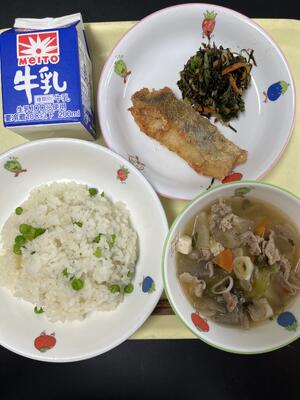 【今日の献立】グリンピースごはん たらのからあげ のりおかかあえ とんじる 牛乳