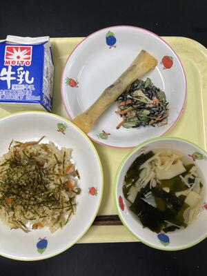 【今日の献立】ピリからごぼうごはん ししゃものパリパリあげ ひじきとツナのマヨあえ わかたけじる 牛乳