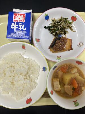 ごはん かつおのくろずあん ごまあえ とりじゃが 牛乳