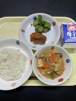さつまいもごはん・牛乳・かつおの立田揚げ・野菜たっぷりみそ汁・柿