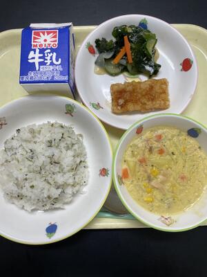 しらすとあおなのごはん いかのレモンじょうゆ わかめとこんにゃくのサラダ こめことうにゅうコーンスープ 牛乳