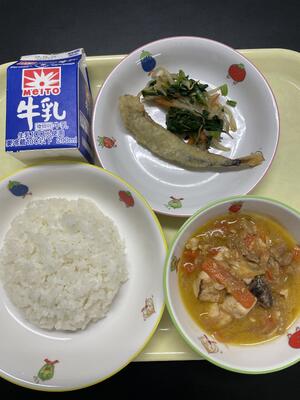 コーン茶めし・牛乳・いかの天ぷら・かぼちゃの天ぷら・豆腐のみそ汁