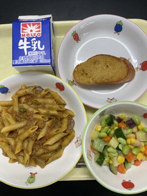 カレーソースペンネ コロコロまめサラダ かみかみハニーレモンラスク 牛乳