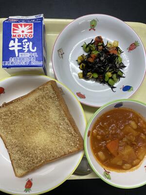 【今日の献立】ハニートースト ポパイサラダ まめとウインナーのトマトに バナナ 牛乳