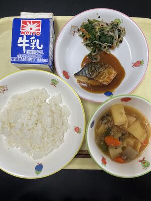 【今日の献立】ごはん さばのごまみそかけ じゃがいものそぼろに のりおかかあえ 牛乳