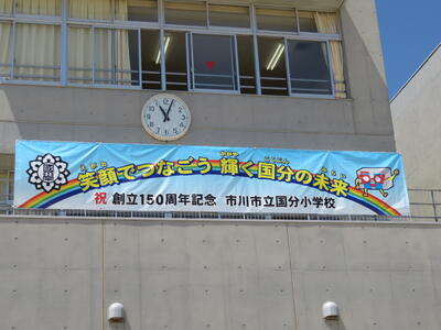 国分小学校は今年度150周年を迎えます。この日は、校庭に大きな校章を人文字で描き、飛行機で撮影してもらいました。そのあと、昨年度末に子供達の投票で選ばれた150周年のテーマとマスコットキャラクターが描かれた大弾幕が披露されました。