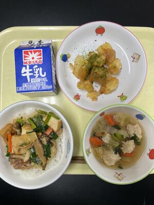 【今日の献立】きのこどん とうふだんごスープ みそポテト 牛乳