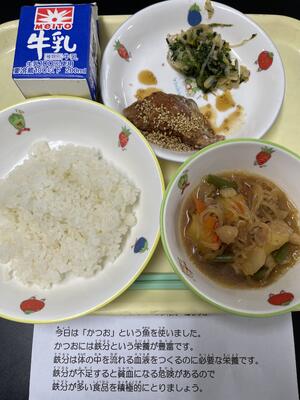 ごはん かつおのくろずあん ごまあえ とりじゃが 牛乳