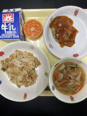 【今日の献立】こぎつねごはん とうふハンバーグ さわにわん はなみかん 牛乳