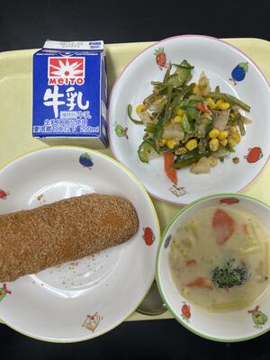 【今日の献立】シナモンあげパン ふゆやさいのクリームに ツナとくきわかめのサラダ 牛乳