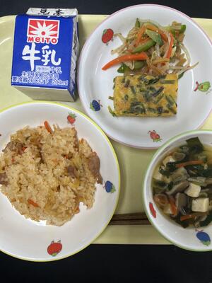 【今日の献立】キムタクごはん ちゅうかオムレツ くらげあえ わかめスープ 牛乳