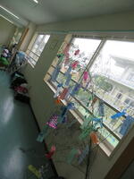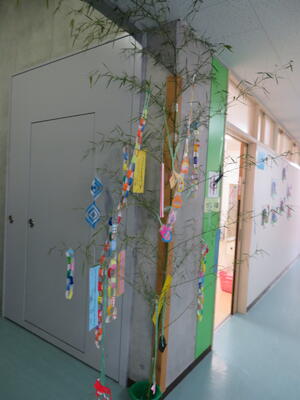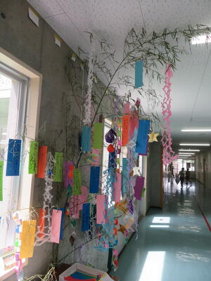 今日7月7日は七夕です。地域の方にいただいた笹が各教室の前や職員室前に飾られています。願い事の短冊や折り紙の七夕飾りがきれいです。みんなの願い事が天に届きますように。給食のメニューも ちらし寿司、そうめん(オクラ入り)、七夕ゼリー(星形の寒天入り)と七夕にちなんだ献立でした。
