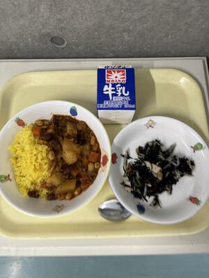【今日の献立】ターメリックライス チリコンカン ひじきのマリネ 牛乳