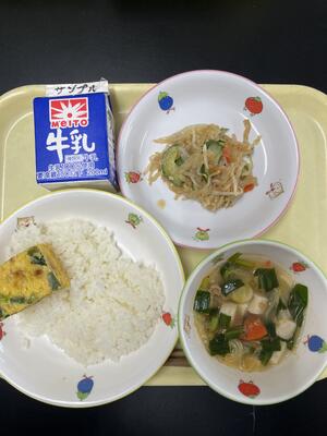 【今日の献立】ごはん ちゅうかオムレツ くらげあえ キムチなべじる 牛乳