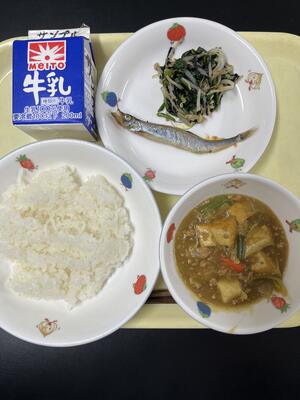 【今日の献立】ごはん あつあげのカレーにこみ やきししゃも いそかあえ 牛乳