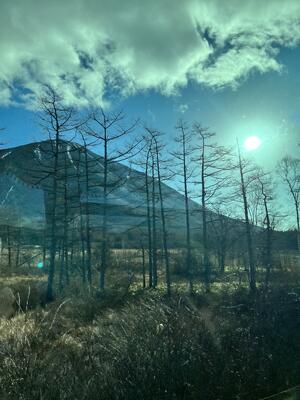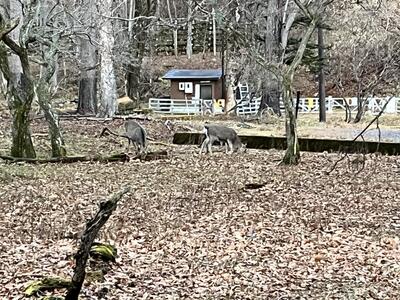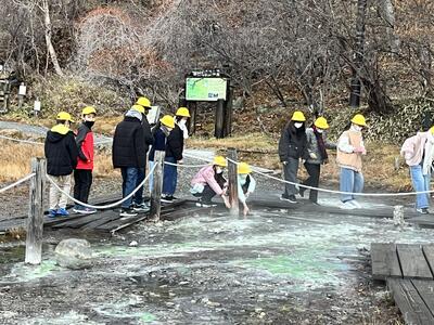 みんな元気に起床!そろって朝の散歩に出かけました!思ったより寒くなく、11月にしては暖かい日光です。行く途中、鹿に遭遇!硫黄の香りとポコポコ湧く温泉を堪能しました!