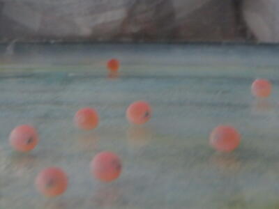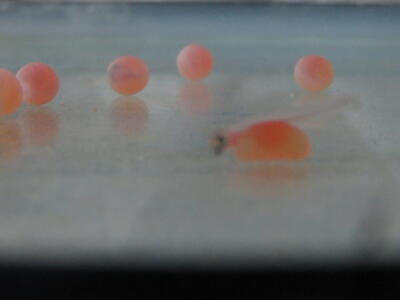今日、水槽のなかで卵が孵化し、卵黄嚢をお腹につけた仔魚も見ることができました。