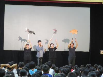 6月22日(木)芸術鑑賞会として、久しぶりに全校で一緒のプログラムを鑑賞しました。「100万回生きた猫」は、絵本で読んだことがある児童がたくさんいましたが、影絵劇は絵本とはまた違う美しさがあり、最後の場面ではどの子も感動していたようです。「影絵教室」では、3人の児童と教員1人が代表に選ばれて、影絵の人形の動かし方などを体験しました。
