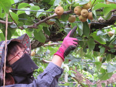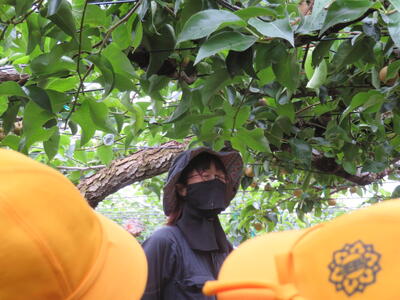 6月23日(金)3年生が梨の栽培についてのお話を聞くために、宇田川梨園さんの梨畑を訪問しました。今の時期は、摘果の2回目の時期だそうで、向きの悪い実や一枝にたくさんついている実を落としていくそうです。摘果の説明のほかにも、梨の種類の話や、肥料の話なども聞くことができました。