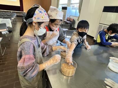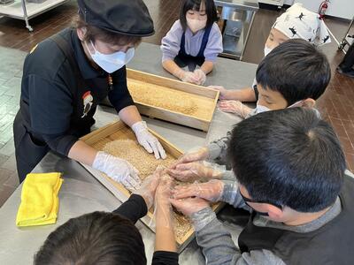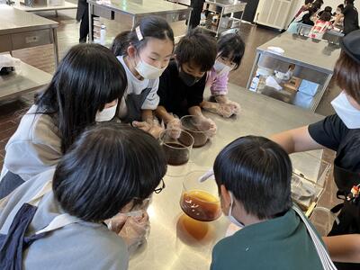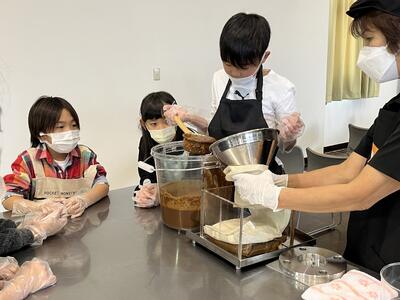 見学では醤油の作り方や歴史、体験では実際に作り方を体験させてもらいました。大豆の変化に驚きの声があちこちからあがってました。