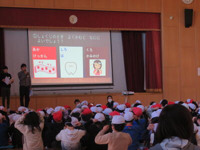 1月25日(木)に本校の学校医、小菅先生をお招きして、学校保健委員会を開きました。今年度のテーマは、「ビューティフル」です。衛生的なハンカチのことや歯磨きに関することなど、健康に関係する事柄を「ビューティフル」の視点からとらえて健康委員会が発表をしました。クイズでは、正解者が少ない問題もあり、盛り上がりました。小菅先生からは、感染症予防の視点からもビューティフルがとてもいい視点になるというお話をしていただきました。